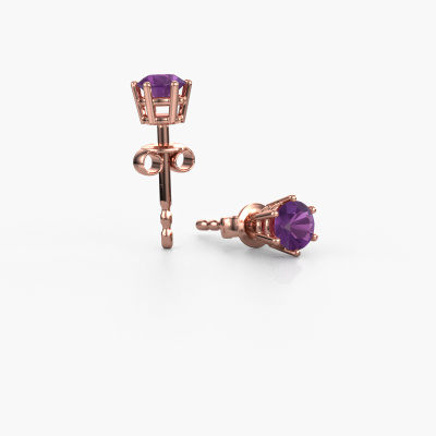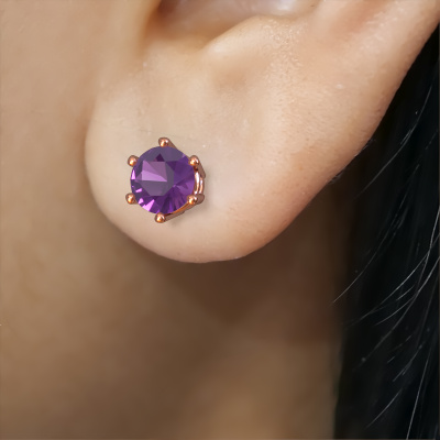 Solitaire earrings are classic yet fashionable pieces of jewellery. In solitaire earrings, the prong setting is open and only 1 stone is set, which helps reflect light on the gemstone from every angle. Because the amethysten are positioned higher, these classic earrings become truly eye-catching. We carefully create each detail of these solitaire earrings by hand. Our expert goldsmiths set the amethysten in these rose gold earrings with the utmost precision, so light reflects evenly from every angle. The earrings are set with 4.2 mm round amethysten. The Fay earrings are made just for you by our master goldsmith in our own artisan studio.. As soon as you finished designing your classic earrings with our online tool, our goldsmiths will start their creative process of making your earrings. This will be done with passion and care, according ancient crafting. On top of that, our jewels are made of eco-friendly materials. If you want specific changes made to your Fay earrings, that are unavailable in our online tool, please feel free to contact our expert designers. After receiving your order, our goldsmiths will start the creative process of making your Fay earrings. We don't keep stock. This is advantageous because these costs will not be passed on to you. Therefore, we can offer jewellery at exceptionally low prices. To make it easier for you, we offer a 30 day return policy. Check our terms and conditions.