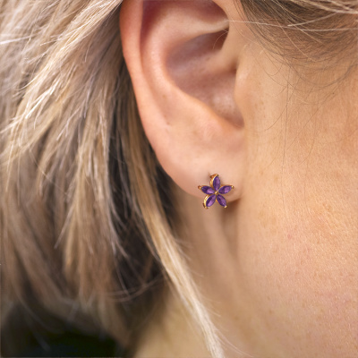 How would you describe your style? Are you looking for something slightly different? These unique cluster gold stud earrings are unique and created by our expert goldsmiths. These unique stud earrings are set with amethyst. Each of the amethysten is carefully selected, because we believe your stud earrings should be adorned with nothing but the most exquisite gemstones. Wouldn't you agree? The Sylvana earrings are made just for you by our master goldsmith in our own artisan studio.. Our goldsmiths passionately create your customized stud earrings to your liking with the utmost care. The gold set stud earrings, as shown here, can be customized using our online tool. Feel free to ask our jewel designers for assistance if you want changes made which are unavailable in our online tool. We are happy to answer your questions.Are you on a budget? Please feel free to contact us, so we can go discuss your options. We offer our stud earrings at guaranteed best price, because we make them to order. You won't find such a price anywhere else! To make it easier for you, we offer a 30 day return policy. Check our terms and conditions.