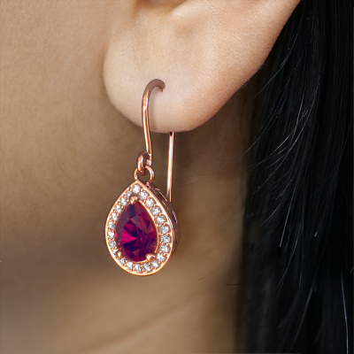 This is our set of trendy Beverlee 1 drop earrings. In this example the drop earrings are set with pear rhodolite. Each of our rhodolite gemstones is carefully selected and positioned in your drop earrings with great precision so light hits the rhodolite from every angle. We believe these drop rose gold drop earrings look best set with coloured gemstones. But that is entirely up to you. Our goldsmiths passionately create your customized drop earrings to your liking with the utmost care. The rose gold set drop earrings, as shown here, can be customized using our online tool. Feel free to ask our jewel designers for assistance if you want changes made which are unavailable in our online tool. We are happy to answer your questions.After receiving your order, our goldsmiths will passionately start the creative process of making your drop earrings in our own studio. Because we don't have a big stockpile, these costs will not be passed on to you. Our pricing is proof of that! We offer top quality jewels at lowest price, guaranteed.To make it easier for you, we offer a 30 day return policy. Check our terms and conditions.