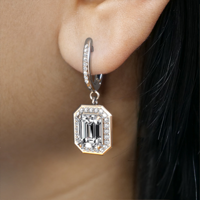 With a pair of exclusive drop earrings, every woman truly stands out. At DiamondsByMe, we create exclusive and extraordinary jewellery and we make use of the finest precious metals and gemstones. These exclusive platinum drop earrings are a true work of art! Each tiny detail has been made with patience and passion by our expert jeweller. This requires a keen eye and skilful hand in order for the ring to be carefully created to perfection. And this is exactly what our expert jewellers strive for, perfection! The exquisite diamonds are set in a way making them seem to shine even brighter. This gives the drop earrings an extra glamorous look. Shown above are our platinum Dodie 2 drop earrings, set with emerald cut diamond. The Dodie 2 earrings are made just for you by our master goldsmith in our own artisan studio.. How do you like these exclusive platinum drop earrings? Simply customize this Dodie 2 drop earrings, using our online tool. Subsequently, your personal halo Dodie 2 drop earrings will be made by hand by our goldsmiths. Precious metals and gemstones can be customized to your liking. Do you have specific preferences which are unavailable in our online tool? Please feel free to contact us. We will customize your personal exclusive drop earrings to your liking. Are you on a budget? Please feel free to contact us, so we can go discuss your options. We offer our drop earrings at guaranteed best price, because we make them to order. You won't find such a price anywhere else! To make it easier for you, we offer a 30 day return policy. Check our terms and conditions.