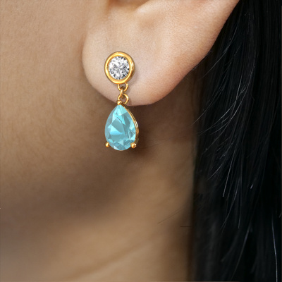 What could possibly be more stunning than a pair of stunning drop earrings? These gold Lacey drop earrings are a true eye-catcher. These graceful drop earrings are set with pear blue topaz. We collaborate with the best suppliers of gemstones and