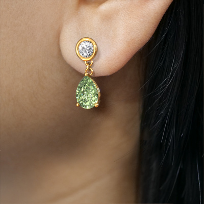 What could possibly be more stunning than a pair of stunning drop earrings? These gold Lacey PER drop earrings are a true eye-catcher. These graceful drop earrings are set with pear green lab grown diamond. We collaborate with the best suppliers of gemstones and they select our gemstones with great care. Your drop earrings are made by hand in our own artisan studio by our expert goldsmiths. Customized fantasy graceful drop earrings are the perfect gift! New exquisite designs are added daily by our team of passionate goldsmiths. And each design can be customized. Simply customize the precious metals and the colour of gemstones which will be used, for example. This makes your design of the fantasy Lacey PER drop earrings truly unique!After receiving your order, our goldsmiths will passionately start the creative process of making your drop earrings in our own studio. Because we don't have a big stockpile, these costs will not be passed on to you. Our pricing is proof of that! We offer top quality jewels at lowest price, guaranteed.To make it easier for you, we offer a 30 day return policy. Check our terms and conditions.