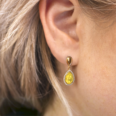 With a pair of exclusive drop earrings, every woman truly stands out. At DiamondsByMe, we create exclusive and extraordinary jewellery and we make use of the finest precious metals and gemstones. These exclusive gold drop earrings are a true work of art! Each tiny detail has been made with patience and passion by our expert jeweller. This requires a keen eye and skilful hand in order for the ring to be carefully created to perfection. And this is exactly what our expert jewellers strive for, perfection! The exquisite yellow sapphire are set in a way making them seem to shine even brighter. This gives the drop earrings an extra glamorous look. Shown above are our gold Tilly per 1 drop earrings, set with pear yellow sapphire. The Tilly per 1 earrings are made just for you by our master goldsmith in our own artisan studio.. As soon as you finished designing your exclusive drop earrings with our online tool, our goldsmiths will start their creative process of making your drop earrings. This will be done with passion and care, according ancient crafting. On top of that, our jewels are made of eco-friendly materials. If you want specific changes made to your Tilly per 1 drop earrings, that are unavailable in our online tool, please feel free to contact our expert designers. Because we design and deliver our own drop earrings, we can offer you drop earrings at a price you won't find anywhere else. drop earrings are made to order, which helps prevent excess supplies, so we can make you a great price offer. We understand it feels risky, buying your drop earrings online, but we will gladly assist in the designing process, taking your budget into consideration. To make it easier for you, we offer a 30 day return policy. Check our terms and conditions.
