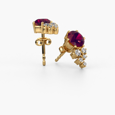 If you are looking for trendy and personal earrings, then these will fit you perfectly. You have the option to add your birthstones to these earrings. Each month has its own birthstone. You may use your own birthstone gemstone or that of your children. A priceless gift, even if it is for yourself. Our expert jeweller will set the selected stones in your earrings with utter precision, so light reflects evenly from every angle. Here, 6 mm round rhodolite gemstones were used to adorn these gold graceful Royce earrings. The Royce earrings are passionately made by one of our master goldsmiths.. The best part of these graceful earrings is that you can customize it to your own liking. Your style, your choice, your earrings. On top of that, your trendy gold earrings will be made by hand with eco-friendly materials! Please feel free to easily customize the earrings, using our online tool. After receiving your order, our goldsmiths will passionately start the creative process of making your earrings in our own studio. Because we don't have a big stockpile, these costs will not be passed on to you. Our pricing is proof of that! We offer top quality jewels at lowest price, guaranteed.To make it easier for you, we offer a 30 day return policy. Check our terms and conditions.