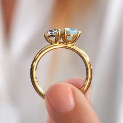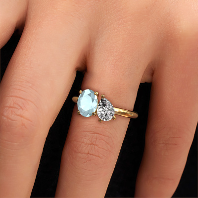 This 14 Carat gold ring is called Toi et Moi OVL-PER and is set with aquamarine. Do you keep up with the latest fashion trends? Do you want a unique engagement ring that matches your lifestyle? This charming engagement ring is an extraordinary ring which can be custom-made to fit your or her personal style. This fashionable gold engagement ring is set with aquamarine. Our aquamarine are carefully selected for this specific ring in order to create the best effect. Our expert goldsmith will create your ring in our own artisan studio where the aquamarine will be set with great care. The ring will then be polished to perfection. Nothing but the best for the love of your life! This jewel is made just for you by our master goldsmiths in our own studio.By using our modern techniques, we can design and customize the finest quality jewels with the utmost care for you. Our engagement rings are always priced 30 percent lower than other jewellers. We make engagement rings to order so we don't have to maintain a large stock. If you have a certain budget, we are more than happy to advice you accordingly.Do you have a specific ring in mind? One you came across somewhere. Please feel free to tell us your wishes and we will turn your design into a unique engagement ring. You can follow the development of your ring design because we use 3D drawings. This gives you a realistic preview of your design. We will gladly send you a non-binding offer, based on a fair price/ quality ratio. It will amaze you.To make it easier for you, we offer a 30 day return policy. Check our terms and conditions.