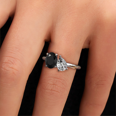This platinum ring is called Toi et Moi OVL-PER and is set with black diamond. Do you keep up with the latest fashion trends? Do you want a unique engagement ring that matches your lifestyle? This charming engagement ring is an extraordinary ring which can be custom-made to fit your or her personal style. This fashionable platinum engagement ring is set with black diamond. Our black diamonds are carefully selected for this specific ring in order to create the best effect. Our expert goldsmith will create your ring in our own artisan studio where the black diamond will be set with great care. The ring will then be polished to perfection. Nothing but the best for the love of your life! This jewel is made just for you by our master goldsmiths in our own studio.By using our modern techniques, we can design and customize the finest quality jewels with the utmost care for you. Our engagement rings are always priced 30 percent lower than other jewellers. We make engagement rings to order so we don't have to maintain a large stock. If you have a certain budget, we are more than happy to advice you accordingly.Do you have a specific ring in mind? One you came across somewhere. Please feel free to tell us your wishes and we will turn your design into a unique engagement ring. You can follow the development of your ring design because we use 3D drawings. This gives you a realistic preview of your design. We will gladly send you a non-binding offer, based on a fair price/ quality ratio. It will amaze you.To make it easier for you, we offer a 30 day return policy. Check our terms and conditions.