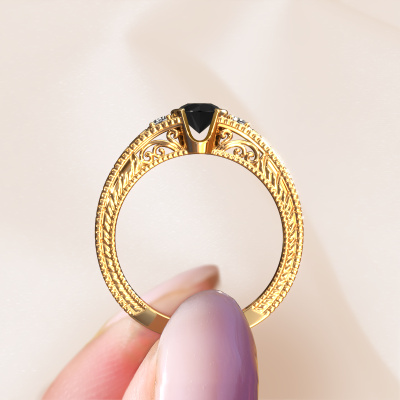 This 14 Carat gold ring is called Anamaria and is set with 0.69 crt black diamond. An extraordinary gold vintage ring. One that will surely make the love of your life shine like a diamond! That is what we hope to achieve. This vintage engagement ring is set with exquisite black diamond. Whichever gemstone you choose from our selection, is up to you. The gemstone is selected with great care because we believe your filigree engagement ring must be adorned with nothing but the most beautiful gemstone. Wouldn't you agree? Our expert goldsmith will design your ring in our own crafting studio, where the black diamond will be set with great precision. The ring will then be polished till it shines perfectly. Nothing but the best for the love of your life! This jewel is made just for you by our master goldsmiths in our own studio.Are you on a budget? Please feel free to contact us, so we can go discuss your options. We offer our engagement rings at guaranteed best price, because we make them to order. You won't find such a price anywhere else!Our team adds new designs to our online collection daily. Our designers and goldsmiths work together in creating the best design. We strive to offer a diverse collection of jewels. Perhaps you have a specific jewel design in mind. One you came across somewhere. Please contact us for a free consultation. We will make you an offer, based on a fair price/ quality ratio, that will baffle you.To make it easier for you, we offer a 30 day return policy. Check our terms and conditions.