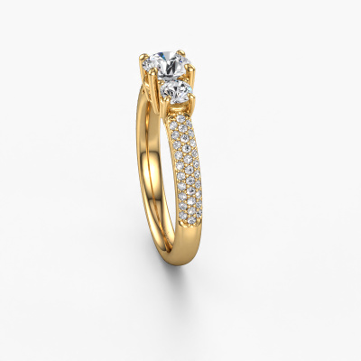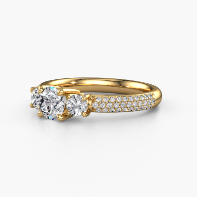 This 14 Carat gold ring is called Marielle RND and is set with 1.37 crt diamond. This exclusive gold 3-stone engagement ring is a true work of art! The ornaments are crafted with a lot of patience and great passion. In order to create this ring with great precision, this craft requires a keen eye and skilful hand. A challenge which ignites a fire in our expert goldsmith. The exquisite diamonds are set in a special way so they stand out even more. This gives the ring an even more glamorous appearance. The tasteful engagement ring is actually unique on its own because of the gemstones which we carefully select especially for this ring. On top of that you select the precious metals which will be used to create a unique ring for the most extraordinary woman in your life! This jewel is made with passion and love by one of our master goldsmiths.By using a combination of the latest modern techniques, combined with ancient crafting, we can make all our engagement rings in our own studio. Each jewel is made to order. This is advantageous because we can offer you a price you won't find anywhere else.Our designers and goldsmiths work together each day, creating new jewels. Perhaps you have found a nice exclusive engagement ring somewhere, which can be used to customize your unique ring. Please feel free to contact us. We will make you an offer, based on a fair price/ quality ratio, which will amaze you.To make it easier for you, we offer a 30 day return policy. Check our terms and conditions.