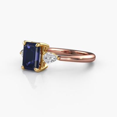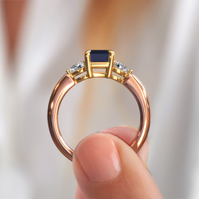 This 14 Carat rose gold ring is called Chanou EME and is set with 7.5x5.5 mm sapphire. For you, there is only one person in your life who stands out in a crowd. Only one that makes your heart skip a beat. A true gem! She, above all others, deserves a special gift. A unique customized jewel made in her honour. We believe this ring is perfect for your special moment. Each detail of this exclusive rose gold 3-stone engagement ring is selected by hand, crafted and polished by our expert goldsmith in our own artisan studio. We strive to achieve the perfect design and composition of the ring, so it enhances the unique features of our sapphire, and lets them shine even brighter. It takes a lot of precision to make but in the end it pays off because of the sheer beauty of the ring. And that is our main goal. It's what gets us excited. The great thing about our online tool is, that you can design your own jewellery into a unique, personalized piece. This unique tasteful engagement ring is created with the precious metal combination of rose gold and gold. But of course you are completely free to select other colours. Each piece of jewellery is made just for you by our master goldsmiths in our own studio.By using a combination of the latest modern techniques, combined with ancient crafting, we can make all our engagement rings in our own studio. Each jewel is made to order. This is advantageous because we can offer you a price you won't find anywhere else.Our designers and goldsmiths work together each day, creating new jewels. Perhaps you have found a nice unique engagement ring somewhere, which can be used to customize your unique ring. Please feel free to contact us. We will make you an offer, based on a fair price/ quality ratio, which will amaze you.To make it easier for you, we offer a 30 day return policy. Check our terms and conditions.