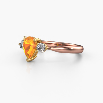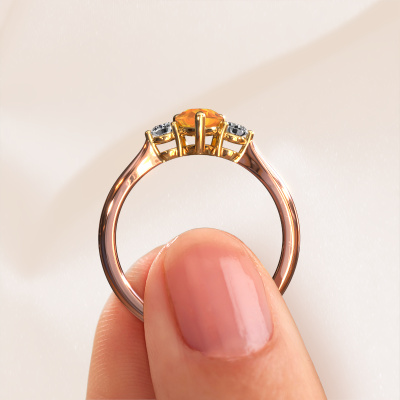 This 14 Carat rose gold ring is called Lieselot PER and is set with 7x5 mm citrin. For you, there is only one person in your life who stands out in a crowd. Only one that makes your heart skip a beat. A true gem! She, above all others, deserves a special gift. A unique customized jewel made in her honour. We believe this ring is perfect for your special moment. Each detail of this exclusive rose gold 3-stone engagement ring is selected by hand, crafted and polished by our expert goldsmith in our own artisan studio. We strive to achieve the perfect design and composition of the ring, so it enhances the unique features of our citrin, and lets them shine even brighter. It takes a lot of precision to make but in the end it pays off because of the sheer beauty of the ring. And that is our main goal. It's what gets us excited. The great thing about our online tool is, that you can design your own jewellery into a unique, personalized piece. This unique special engagement ring is created with the precious metal combination of rose gold and gold. But of course you are completely free to select other colours. Each piece of jewellery is made with passion and love by one of our master goldsmiths.Are you on a budget? Please feel free to contact us, so we can go discuss your options. We offer our engagement rings at guaranteed best price, because we make them to order. You won't find such a price anywhere else!Different styles of new rings are made daily by our team. Perhaps you have found a 3-stone engagement ring somewhere. One you would like to give to your loved one. Please feel free to share your thoughts and design with our jewel designers. We would love to turn your design into a fashionable engagement ring. You can follow the development of your ring design because we use very detailed 3D drawings. On top of that, you can order a dummy of the design. A dummy is a plastic ring, which can be shaped according your ring design. You can try it on and check if the engagement ring is up to standard. We will gladly send you a non-binding offer, based on a fair price/ quality ratio. The offer will baffle you, considering the quality of the ring and gemstones.To make it easier for you, we offer a 30 day return policy. Check our terms and conditions.