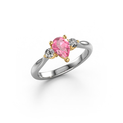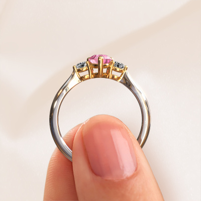 This 14 Carat white gold ring is called Lieselot PER and is set with 7x5 mm pink sapphire. For you, there is only one person in your life who stands out in a crowd. Only one that makes your heart skip a beat. A true gem! She, above all others, deserves a special gift. A unique customized jewel made in her honour. We believe this ring is perfect for your special moment. Each detail of this exclusive white gold 3-stone engagement ring is selected by hand, crafted and polished by our expert goldsmith in our own artisan studio. We strive to achieve the perfect design and composition of the ring, so it enhances the unique features of our pink sapphire, and lets them shine even brighter. It takes a lot of precision to make but in the end it pays off because of the sheer beauty of the ring. And that is our main goal. It's what gets us excited. The great thing about our online tool is, that you can design your own jewellery into a unique, personalized piece. This unique special engagement ring is created with the precious metal combination of white gold and gold. But of course you are completely free to select other colours. Each piece of jewellery is made with passion and love by one of our master goldsmiths.Are you on a budget? Please feel free to contact us, so we can go discuss your options. We offer our engagement rings at guaranteed best price, because we make them to order. You won't find such a price anywhere else!Different styles of new rings are made daily by our team. Perhaps you have found a 3-stone engagement ring somewhere. One you would like to give to your loved one. Please feel free to share your thoughts and design with our jewel designers. We would love to turn your design into a fashionable engagement ring. You can follow the development of your ring design because we use very detailed 3D drawings. On top of that, you can order a dummy of the design. A dummy is a plastic ring, which can be shaped according your ring design. You can try it on and check if the engagement ring is up to standard. We will gladly send you a non-binding offer, based on a fair price/ quality ratio. The offer will baffle you, considering the quality of the ring and gemstones.To make it easier for you, we offer a 30 day return policy. Check our terms and conditions.