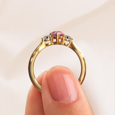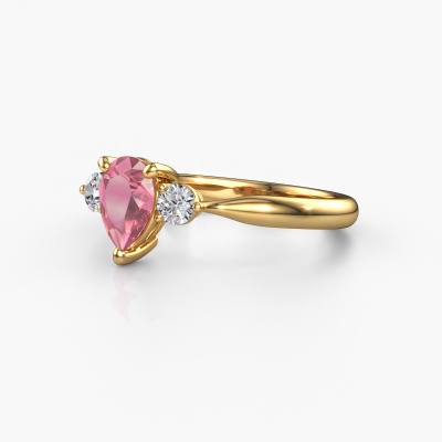 This 14 Carat gold ring is called Lieselot PER and is set with 7x5 mm tourmaline pink. For you, there is only one person in your life who stands out in a crowd. Only one that makes your heart skip a beat. A true gem! She, above all others, deserves a special gift. A unique customized jewel made in her honour. We believe this ring is perfect for your special moment. Each detail of this exclusive gold 3-stone engagement ring is selected by hand, crafted and polished by our expert goldsmith in our own artisan studio. We strive to achieve the perfect design and composition of the ring, so it enhances the unique features of our tourmaline pink, and lets them shine even brighter. It takes a lot of precision to make but in the end it pays off because of the sheer beauty of the ring. And that is our main goal. It's what gets us excited. The great thing about our online tool is, that you can design your own jewellery into a unique, personalized piece. This unique special engagement ring is created with the precious metal combination of gold and gold. But of course you are completely free to select other colours. Each piece of jewellery is made with passion and love by one of our master goldsmiths.Are you on a budget? Please feel free to contact us, so we can go discuss your options. We offer our engagement rings at guaranteed best price, because we make them to order. You won't find such a price anywhere else!Different styles of new rings are made daily by our team. Perhaps you have found a 3-stone engagement ring somewhere. One you would like to give to your loved one. Please feel free to share your thoughts and design with our jewel designers. We would love to turn your design into a fashionable engagement ring. You can follow the development of your ring design because we use very detailed 3D drawings. On top of that, you can order a dummy of the design. A dummy is a plastic ring, which can be shaped according your ring design. You can try it on and check if the engagement ring is up to standard. We will gladly send you a non-binding offer, based on a fair price/ quality ratio. The offer will baffle you, considering the quality of the ring and gemstones.To make it easier for you, we offer a 30 day return policy. Check our terms and conditions.