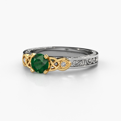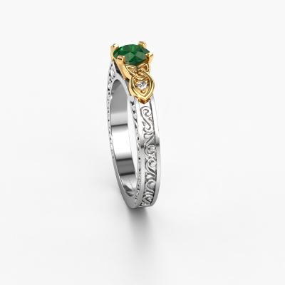 This 14 Carat white gold ring is called Gillian and is set with 5 mm emerald. Is your girlfriend hooked on vintage? Then this white gold ajour engagement ring will surely match her style perfectly. A trendy ring with just a hint of vintage adornment. A truly stunning, romantic design! Especially when you customize your ring to your own liking. This vintage 3-stone engagement ring is set with stunning emerald. As you can see, you are the boss in selecting a gemstone which matches the style of your girlfriend best. Each gemstone is carefully selected by our merchants whom are spread throughout the world. Nothing but the best gems for our expert goldsmith. After all, it is his crowning glory! Each jewel is made just for you, with attention to detail and design.After receiving your order, our goldsmiths will passionately start the creative process of making your engagement ring in our own studio. Because we don't have a big stockpile, these costs will not be passed on to you. Our pricing is proof of that! We offer top quality jewels at lowest price, guaranteed.Different styles of new rings are made daily by our team. Perhaps you have found a 3-stone engagement ring somewhere. One you would like to give to your loved one. Please feel free to share your thoughts and design with our jewel designers. We would love to turn your design into a vintage engagement ring. You can follow the development of your ring design because we use very detailed 3D drawings. On top of that, you can order a dummy of the design. A dummy is a plastic ring, which can be shaped according your ring design. You can try it on and check if the engagement ring is up to standard. We will gladly send you a non-binding offer, based on a fair price/ quality ratio. The offer will baffle you, considering the quality of the ring and gemstones.To make it easier for you, we offer a 30 day return policy. Check our terms and conditions.