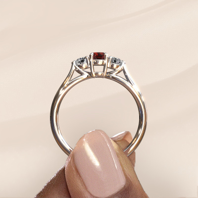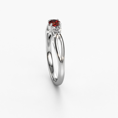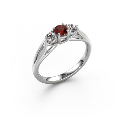 This 14 Carat white gold ring is called Amie RND and is set with 4.2 mm garnet. This exclusive white gold 3-stone engagement ring is a true work of art! The ornaments are crafted with a lot of patience and great passion. In order to create this ring with great precision, this craft requires a keen eye and skilful hand. A challenge which ignites a fire in our expert goldsmith. The exquisite garnet are set in a special way so they stand out even more. This gives the ring an even more glamorous appearance. The graceful engagement ring is actually unique on its own because of the gemstones which we carefully select especially for this ring. On top of that you select the precious metals which will be used to create a unique ring for the most extraordinary woman in your life! This jewel is made with passion and love by one of our master goldsmiths.Because we design and deliver our own rings, we can offer you a engagement ring at a price you won't find anywhere else. A ring is made to order, which helps prevent excess supplies, so we can make you a great price offer. We understand it feels risky, buying your engagement ring online, but we will gladly assist in the designing process, taking your budget into consideration.Our designers and goldsmiths work together each day, creating new jewels. Perhaps you have found a nice classic engagement ring somewhere, which can be used to customize your unique ring. Please feel free to contact us. We will make you an offer, based on a fair price/ quality ratio, which will amaze you.To make it easier for you, we offer a 30 day return policy. Check our terms and conditions.
