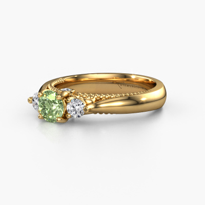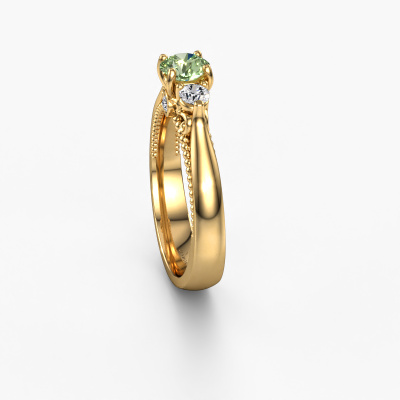 This 14 Carat gold ring is called Tiffani and is set with 5 mm green lab grown diamond. This exclusive gold 3-stone engagement ring is a true work of art! The ornaments are crafted with a lot of patience and great passion. In order to create this ring with great precision, this craft requires a keen eye and skilful hand. A challenge which ignites a fire in our expert goldsmith. The exquisite green lab grown diamonds are set in a special way so they stand out even more. This gives the ring an even more glamorous appearance. The ajour engagement ring is actually unique on its own because of the gemstones which we carefully select especially for this ring. On top of that you select the precious metals which will be used to create a unique ring for the most extraordinary woman in your life! This jewel is made just for you by our master goldsmiths in our own studio.After receiving your order, our goldsmiths will passionately start the creative process of making your engagement ring in our own studio. Because we don't have a big stockpile, these costs will not be passed on to you. Our pricing is proof of that! We offer top quality jewels at lowest price, guaranteed.Have you found a specific engagement ring somewhere which you would like to give to your loved one? Please feel free to express your wishes to our jewel designers because we would be honoured to turn your design into a unique engagement ring. You can follow the development of your ring design because we use 3D drawings. This gives you a realistic preview of how your design will look. You can also preorder a dummy. A dummy is a plastic ring, which can be shaped according your ring design. You can try it on and check if its width and size are suitable for you. We will gladly send you a non-binding offer, based on a fair price/ quality ratio. It will amaze you, considering the quality of the ring and gemstones.To make it easier for you, we offer a 30 day return policy. Check our terms and conditions.