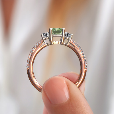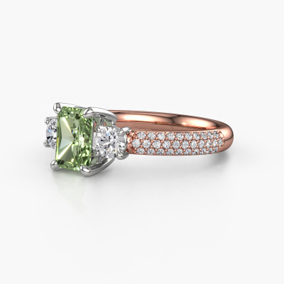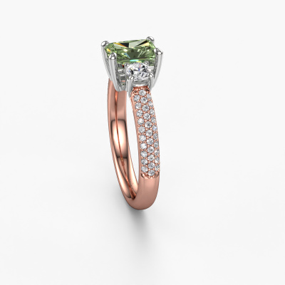 This 14 Carat rose gold ring is called Marielle RAD and is set with 7x5 mm green lab grown diamond. This exclusive rose gold 3-stone engagement ring is a true work of art! The ornaments are crafted with a lot of patience and great passion. In order to create this ring with great precision, this craft requires a keen eye and skilful hand. A challenge which ignites a fire in our expert goldsmith. The exquisite green lab grown diamonds are set in a special way so they stand out even more. This gives the ring an even more glamorous appearance. The graceful engagement ring is actually unique on its own because of the gemstones which we carefully select especially for this ring. On top of that you select the precious metals which will be used to create a unique ring for the most extraordinary woman in your life! This jewel is created to add sparkle to your finger, each jewel is lovingly made by hand by our goldsmiths.By using a combination of the latest modern techniques, combined with ancient crafting, we can make all our engagement rings in our own studio. Each jewel is made to order. This is advantageous because we can offer you a price you won't find anywhere else.Different styles of new rings are made daily by our team. Perhaps you have found a 3-stone engagement ring somewhere. One you would like to give to your loved one. Please feel free to share your thoughts and design with our jewel designers. We would love to turn your design into a contemporary engagement ring. You can follow the development of your ring design because we use very detailed 3D drawings. On top of that, you can order a dummy of the design. A dummy is a plastic ring, which can be shaped according your ring design. You can try it on and check if the engagement ring is up to standard. We will gladly send you a non-binding offer, based on a fair price/ quality ratio. The offer will baffle you, considering the quality of the ring and gemstones.To make it easier for you, we offer a 30 day return policy. Check our terms and conditions.
