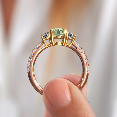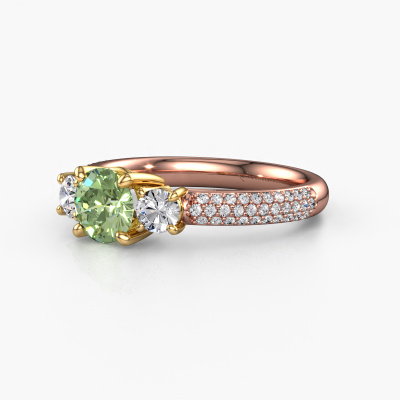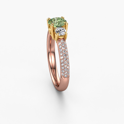 This 14 Carat rose gold ring is called Marielle RND and is set with 6 mm green lab grown diamond. This exclusive rose gold 3-stone engagement ring is a true work of art! The ornaments are crafted with a lot of patience and great passion. In order to create this ring with great precision, this craft requires a keen eye and skilful hand. A challenge which ignites a fire in our expert goldsmith. The exquisite green lab grown diamonds are set in a special way so they stand out even more. This gives the ring an even more glamorous appearance. The tasteful engagement ring is actually unique on its own because of the gemstones which we carefully select especially for this ring. On top of that you select the precious metals which will be used to create a unique ring for the most extraordinary woman in your life! This jewel is made with passion and love by one of our master goldsmiths.By using a combination of the latest modern techniques, combined with ancient crafting, we can make all our engagement rings in our own studio. Each jewel is made to order. This is advantageous because we can offer you a price you won't find anywhere else.Our designers and goldsmiths work together each day, creating new jewels. Perhaps you have found a nice exclusive engagement ring somewhere, which can be used to customize your unique ring. Please feel free to contact us. We will make you an offer, based on a fair price/ quality ratio, which will amaze you.To make it easier for you, we offer a 30 day return policy. Check our terms and conditions.