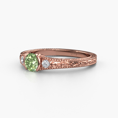 This 14 Carat rose gold ring is called Anamaria and is set with 5 mm green lab grown diamond. An extraordinary rose gold vintage ring. One that will surely make the love of your life shine like a diamond! That is what we hope to achieve. This vintage engagement ring is set with exquisite green lab grown diamond. Whichever gemstone you choose from our selection, is up to you. The gemstone is selected with great care because we believe your filigree engagement ring must be adorned with nothing but the most beautiful gemstone. Wouldn't you agree? Our expert goldsmith will design your ring in our own crafting studio, where the green lab grown diamond will be set with great precision. The ring will then be polished till it shines perfectly. Nothing but the best for the love of your life! This jewel is made just for you by our master goldsmiths in our own studio.Are you on a budget? Please feel free to contact us, so we can go discuss your options. We offer our engagement rings at guaranteed best price, because we make them to order. You won't find such a price anywhere else!Our team adds new designs to our online collection daily. Our designers and goldsmiths work together in creating the best design. We strive to offer a diverse collection of jewels. Perhaps you have a specific jewel design in mind. One you came across somewhere. Please contact us for a free consultation. We will make you an offer, based on a fair price/ quality ratio, that will baffle you.To make it easier for you, we offer a 30 day return policy. Check our terms and conditions.