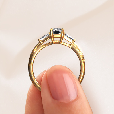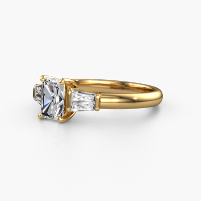 This 14 Carat gold ring is called Kina RAD and is set with 1.07 crt lab grown diamond. This exclusive gold 3-stone engagement ring is a true work of art! The ornaments are crafted with a lot of patience and great passion. In order to create this ring with great precision, this craft requires a keen eye and skilful hand. A challenge which ignites a fire in our expert goldsmith. The exquisite lab-grown diamonds are set in a special way so they stand out even more. This gives the ring an even more glamorous appearance. The graceful engagement ring is actually unique on its own because of the gemstones which we carefully select especially for this ring. On top of that you select the precious metals which will be used to create a unique ring for the most extraordinary woman in your life! This jewel is made just for you, with attention to detail and design.After receiving your order, our goldsmiths will passionately start the creative process of making your engagement ring in our own studio. Because we don't have a big stockpile, these costs will not be passed on to you. Our pricing is proof of that! We offer top quality jewels at lowest price, guaranteed.Have you found a specific engagement ring somewhere which you would like to give to your loved one? Please feel free to express your wishes to our jewel designers because we would be honoured to turn your design into a unique engagement ring. You can follow the development of your ring design because we use 3D drawings. This gives you a realistic preview of how your design will look. You can also preorder a dummy. A dummy is a plastic ring, which can be shaped according your ring design. You can try it on and check if its width and size are suitable for you. We will gladly send you a non-binding offer, based on a fair price/ quality ratio. It will amaze you, considering the quality of the ring and gemstones.To make it easier for you, we offer a 30 day return policy. Check our terms and conditions.