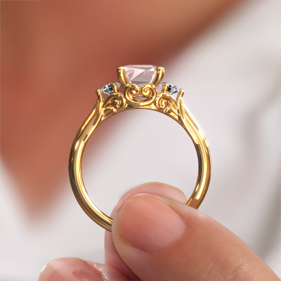This 14 Carat gold ring is called Laurian EME and is set with 8x6 mm morganite champagne. This exclusive gold 3-stone engagement ring is a true work of art! The ornaments are crafted with a lot of patience and great passion. In order to create this ring with great precision, this craft requires a keen eye and skilful hand. A challenge which ignites a fire in our expert goldsmith. The exquisite morganite champagne are set in a special way so they stand out even more. This gives the ring an even more glamorous appearance. The special engagement ring is actually unique on its own because of the gemstones which we carefully select especially for this ring. On top of that you select the precious metals which will be used to create a unique ring for the most extraordinary woman in your life! This jewel is unique in every way! Simply customize to your liking,By using a combination of the latest modern techniques, combined with ancient crafting, we can make all our engagement rings in our own studio. Each jewel is made to order. This is advantageous because we can offer you a price you won't find anywhere else.Our team adds new designs to our online collection daily. Our designers and goldsmiths work together in creating the best design. We strive to offer a diverse collection of jewels. Perhaps you have a specific jewel design in mind. One you came across somewhere. Please contact us for a free consultation. We will make you an offer, based on a fair price/ quality ratio, that will baffle you.To make it easier for you, we offer a 30 day return policy. Check our terms and conditions.