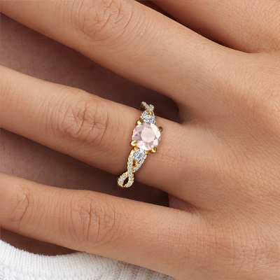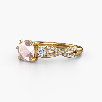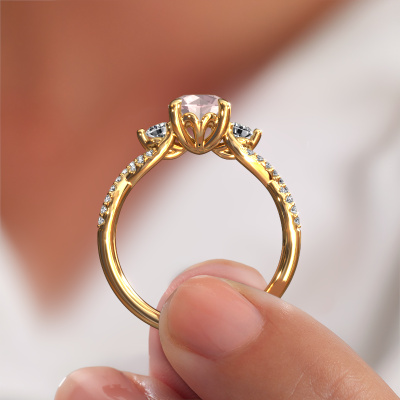 This 14 Carat gold ring is called Marilou RND and is set with 6.5 mm morganite champagne. This exclusive gold 3-stone engagement ring is a true work of art! The ornaments are crafted with a lot of patience and great passion. In order to create this ring with great precision, this craft requires a keen eye and skilful hand. A challenge which ignites a fire in our expert goldsmith. The exquisite morganite champagne are set in a special way so they stand out even more. This gives the ring an even more glamorous appearance. The split band engagement ring is actually unique on its own because of the gemstones which we carefully select especially for this ring. On top of that you select the precious metals which will be used to create a unique ring for the most extraordinary woman in your life! This jewel is made just for you, with attention to detail and design.Are you on a budget? Please feel free to contact us, so we can go discuss your options. We offer our engagement rings at guaranteed best price, because we make them to order. You won't find such a price anywhere else!Have you found a specific engagement ring somewhere which you would like to give to your loved one? Please feel free to express your wishes to our jewel designers because we would be honoured to turn your design into a fantasy engagement ring. You can follow the development of your ring design because we use 3D drawings. This gives you a realistic preview of how your design will look. You can also preorder a dummy. A dummy is a plastic ring, which can be shaped according your ring design. You can try it on and check if its width and size are suitable for you. We will gladly send you a non-binding offer, based on a fair price/ quality ratio. It will amaze you, considering the quality of the ring and gemstones.To make it easier for you, we offer a 30 day return policy. Check our terms and conditions.
