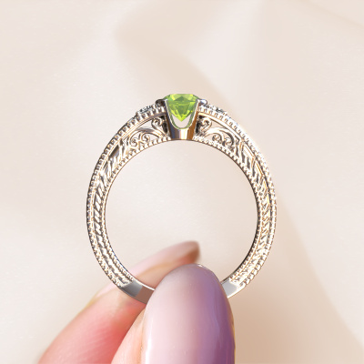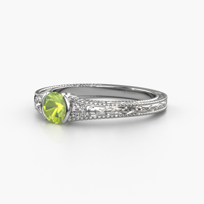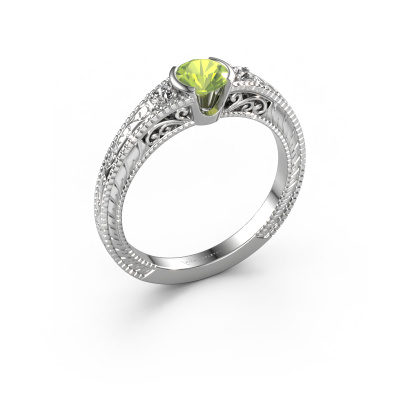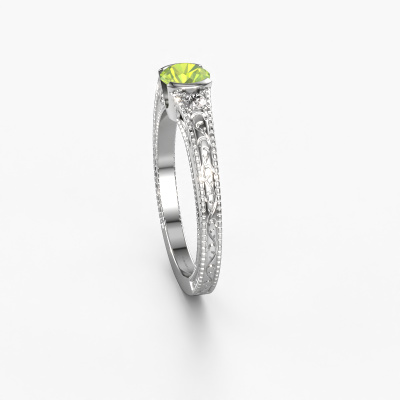 This 14 Carat white gold ring is called Anamaria and is set with 5 mm peridot. An extraordinary white gold vintage ring. One that will surely make the love of your life shine like a diamond! That is what we hope to achieve. This vintage engagement ring is set with exquisite peridot. Whichever gemstone you choose from our selection, is up to you. The gemstone is selected with great care because we believe your filigree engagement ring must be adorned with nothing but the most beautiful gemstone. Wouldn't you agree? Our expert goldsmith will design your ring in our own crafting studio, where the peridot will be set with great precision. The ring will then be polished till it shines perfectly. Nothing but the best for the love of your life! This jewel is made just for you by our master goldsmiths in our own studio.Are you on a budget? Please feel free to contact us, so we can go discuss your options. We offer our engagement rings at guaranteed best price, because we make them to order. You won't find such a price anywhere else!Our team adds new designs to our online collection daily. Our designers and goldsmiths work together in creating the best design. We strive to offer a diverse collection of jewels. Perhaps you have a specific jewel design in mind. One you came across somewhere. Please contact us for a free consultation. We will make you an offer, based on a fair price/ quality ratio, that will baffle you.To make it easier for you, we offer a 30 day return policy. Check our terms and conditions.