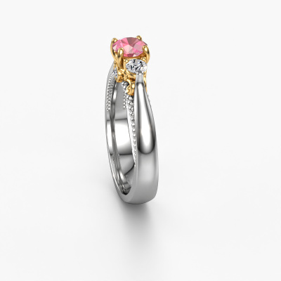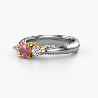 This 14 Carat white gold ring is called Tiffani and is set with 5 mm tourmaline pink. This exclusive white gold 3-stone engagement ring is a true work of art! The ornaments are crafted with a lot of patience and great passion. In order to create this ring with great precision, this craft requires a keen eye and skilful hand. A challenge which ignites a fire in our expert goldsmith. The exquisite tourmaline pink are set in a special way so they stand out even more. This gives the ring an even more glamorous appearance. The ajour engagement ring is actually unique on its own because of the gemstones which we carefully select especially for this ring. On top of that you select the precious metals which will be used to create a unique ring for the most extraordinary woman in your life! This jewel is made just for you by our master goldsmiths in our own studio.After receiving your order, our goldsmiths will passionately start the creative process of making your engagement ring in our own studio. Because we don't have a big stockpile, these costs will not be passed on to you. Our pricing is proof of that! We offer top quality jewels at lowest price, guaranteed.Have you found a specific engagement ring somewhere which you would like to give to your loved one? Please feel free to express your wishes to our jewel designers because we would be honoured to turn your design into a unique engagement ring. You can follow the development of your ring design because we use 3D drawings. This gives you a realistic preview of how your design will look. You can also preorder a dummy. A dummy is a plastic ring, which can be shaped according your ring design. You can try it on and check if its width and size are suitable for you. We will gladly send you a non-binding offer, based on a fair price/ quality ratio. It will amaze you, considering the quality of the ring and gemstones.To make it easier for you, we offer a 30 day return policy. Check our terms and conditions.