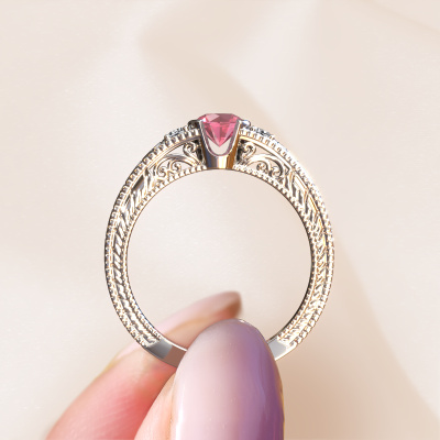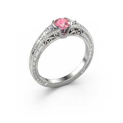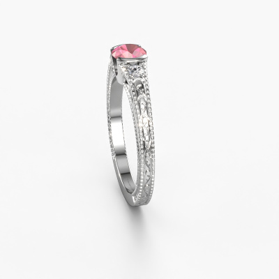 This 14 Carat white gold ring is called Anamaria and is set with 5 mm tourmaline pink. An extraordinary white gold vintage ring. One that will surely make the love of your life shine like a diamond! That is what we hope to achieve. This vintage engagement ring is set with exquisite tourmaline pink. Whichever gemstone you choose from our selection, is up to you. The gemstone is selected with great care because we believe your filigree engagement ring must be adorned with nothing but the most beautiful gemstone. Wouldn't you agree? Our expert goldsmith will design your ring in our own crafting studio, where the tourmaline pink will be set with great precision. The ring will then be polished till it shines perfectly. Nothing but the best for the love of your life! This jewel is made just for you by our master goldsmiths in our own studio.Are you on a budget? Please feel free to contact us, so we can go discuss your options. We offer our engagement rings at guaranteed best price, because we make them to order. You won't find such a price anywhere else!Our team adds new designs to our online collection daily. Our designers and goldsmiths work together in creating the best design. We strive to offer a diverse collection of jewels. Perhaps you have a specific jewel design in mind. One you came across somewhere. Please contact us for a free consultation. We will make you an offer, based on a fair price/ quality ratio, that will baffle you.To make it easier for you, we offer a 30 day return policy. Check our terms and conditions.