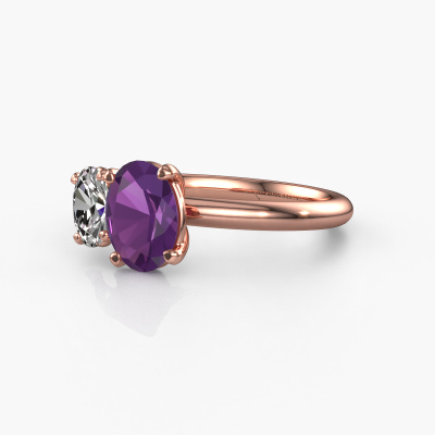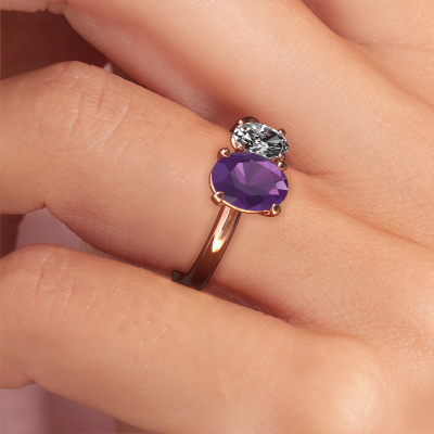 This 14 Carat rose gold ring is called Toi et Moi OVL-OVL and is set with amethyst. How would you describe the style of the love of your life? Does she have a unique sense of style? This stunning sublime rose gold engagement ring can be custom-made to your own or her liking. Our amethysten gemstones have been carefully selected because we believe your modern engagement ring must be adorned with nothing but the most beautiful gemstone. Don't you agree? This jewel is made by a team of passionate goldsmiths and jewel designers. This will make your crown jewel truly eye-catching.After receiving your order, our goldsmiths will start the creative process of making your Toi et Moi OVL-OVL engagement ring. We don't keep stock. This is advantageous because these costs will not be passed on to you. Therefore, we can offer jewellery at exceptionally low prices.Different styles of new rings are made daily by our team. Perhaps you have found a 2 stone engagement ring somewhere. One you would like to give to your loved one. Please feel free to share your thoughts and design with our jewel designers. We would love to turn your design into a modern engagement ring. You can follow the development of your ring design because we use very detailed 3D drawings. On top of that, you can order a dummy of the design. A dummy is a plastic ring, which can be shaped according your ring design. You can try it on and check if the engagement ring is up to standard. We will gladly send you a non-binding offer, based on a fair price/ quality ratio. The offer will baffle you, considering the quality of the ring and gemstones.To make it easier for you, we offer a 30 day return policy. Check our terms and conditions.