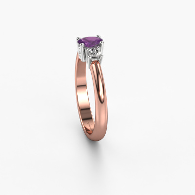 This 14 Carat rose gold ring is called Karie and is set with amethyst. How would you describe the style of the love of your life? Does she have a unique sense of style? This stunning ajour rose gold engagement ring can be custom-made to your own or her liking. Our amethysten gemstones have been carefully selected because we believe your traditional engagement ring must be adorned with nothing but the most beautiful gemstone. Don't you agree? This jewel is made just for you by our master goldsmiths in our own studio.After receiving your order, our goldsmiths will passionately start the creative process of making your engagement ring in our own studio. Because we don't have a big stockpile, these costs will not be passed on to you. Our pricing is proof of that! We offer top quality jewels at lowest price, guaranteed.Do you have a specific ring in mind? One you came across somewhere. Please feel free to tell us your wishes and we will turn your design into a unique engagement ring. You can follow the development of your ring design because we use 3D drawings. This gives you a realistic preview of your design. We will gladly send you a non-binding offer, based on a fair price/ quality ratio. It will amaze you.To make it easier for you, we offer a 30 day return policy. Check our terms and conditions.