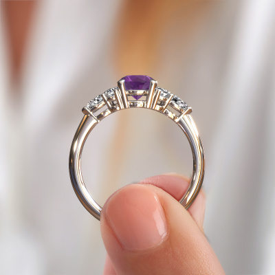 This platinum ring is called Melani RND and is set with amethyst. How would you describe the style of the love of your life? Does she have a unique sense of style? This stunning charming platinum engagement ring can be custom-made to your own or her liking. Our amethysten gemstones have been carefully selected because we believe your contemporary engagement ring must be adorned with nothing but the most beautiful gemstone. Don't you agree? This jewel is made just for you by our master goldsmiths in our own studio.Because we design and deliver our own rings, we can offer you a engagement ring at a price you won't find anywhere else. A ring is made to order, which helps prevent excess supplies, so we can make you a great price offer. We understand it feels risky, buying your engagement ring online, but we will gladly assist in the designing process, taking your budget into consideration.Our team adds new designs to our online collection daily. Our designers and goldsmiths work together in creating the best design. We strive to offer a diverse collection of jewels. Perhaps you have a specific jewel design in mind. One you came across somewhere. Please contact us for a free consultation. We will make you an offer, based on a fair price/ quality ratio, that will baffle you.To make it easier for you, we offer a 30 day return policy. Check our terms and conditions.