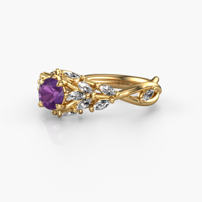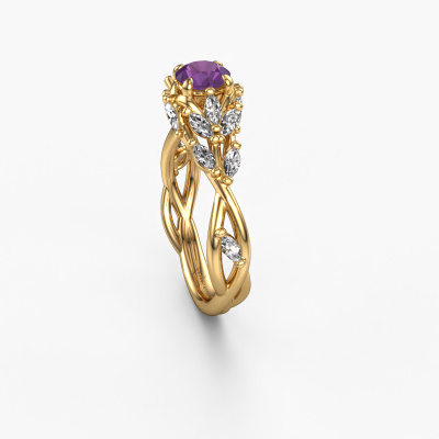 The ring shown above is called the Samantha RND. We call this type of ring a pavé solitaire ring because it has one centre gemstone and a band that is also pave set with gemstones. This engagement ring is made in 14 Carat gold set with a 5 mm round amethyst, and pave set diamonds at the sides. Each piece of jewellery is made with passion and love by one of our master goldsmiths.This contemporary gold pavé solitaire engagement ring has an exquisite round amethyst centre stone. To further accentuate the centre stone, the band is set full with more diamonds. Its open prong setting allows light to strike the amethyst from various angles and this adds sparkle to your amethyst ring. The photo shown above depicts the goldsmith's carefully handcrafted details of the ring. The high positioning of the centre stone is truly eye-catching. The perfect engagement ring for the crown jewel of your life!By using a combination of the latest modern techniques, combined with ancient crafting, we can make all our engagement rings in our own studio. Each jewel is made to order. This is advantageous because we can offer you a price you won't find anywhere else.Our designers and goldsmiths work together each day, creating new jewels. Perhaps you have found a nice contemporary engagement ring somewhere, which can be used to customize your unique ring. Please feel free to contact us. We will make you an offer, based on a fair price/ quality ratio, which will amaze you.To make it easier for you, we offer a 30 day return policy. Check our terms and conditions.