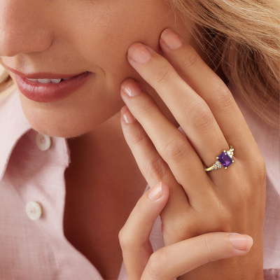 This 14 Carat gold ring is called Royce EME and is set with 8x6 mm amethyst. What is it that makes your relationship unique? What is it about her that makes you want to bend down on one knee? The unique bond between the two of you is emphasized by