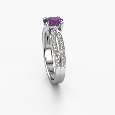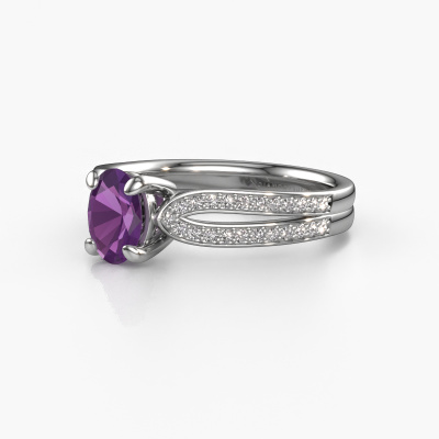 The ring shown above is called the Antonia ovl 2. We call this type of ring a pavé solitaire ring because it has one centre gemstone and a band that is also pave set with gemstones. The platinum engagement ring is set with a oval 7x5 mm amethyst centre stone and the band is pave set with diamond gemstones. Each jewel is unique in every way! Simply customize to your liking,This contemporary platinum pavé solitaire engagement ring has an exquisite oval amethyst centre stone. To further accentuate the centre stone, the band is fully set with more diamonds. Its open prong setting allows light to strike the amethyst from various angles and this adds sparkle to your amethyst ring. The photo shown above depicts the goldsmith's carefully handcrafted details of the ring. The high positioning of the centre stone is truly eye-catching. The perfect engagement ring for the crown jewel of your life! By using a combination of the latest modern techniques, combined with ancient crafting, we can make all our engagement rings in our own studio. Each jewel is made to order. This is advantageous because we can offer you a price you won't find anywhere else.Our team adds new designs to our online collection daily. Our designers and goldsmiths work together in creating the best design. We strive to offer a diverse collection of jewels. Perhaps you have a specific jewel design in mind. One you came across somewhere. Please contact us for a free consultation. We will make you an offer, based on a fair price/ quality ratio, that will baffle you.To make it easier for you, we offer a 30 day return policy. Check our terms and conditions.