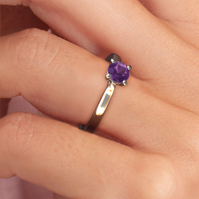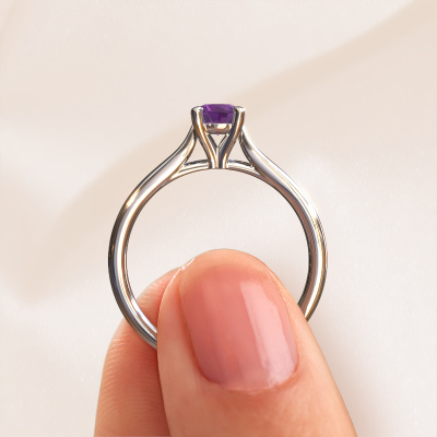 The ring shown above is called the Mignon rnd 1, we call this a solitaire ring because it contains a single gemstone. The engagement ring is made in platinum and has a round amethyst of 5 mm. The cool thing about our configurator is that you can compile your own piece of jewellery, into a completely personalized one. This solitaire ring is crafted in the precious metals platinum with platinum, but of course you are free to pick your own colours. Each piece of jewellery is made with passion and love by one of our master goldsmiths.The solitaire ring is a special type of engagement ring. Its open prong setting allows light to strike the gemstone from various angles. This classic engagement ring is a stunning eye-catcher because of the high positioning of the gemstone. In order for you to commemorate your proposal with a unique ring, we carefully adorn this solitaire ring by hand. The love of your life deserves nothing but the best. After receiving your order, our goldsmiths will passionately start the creative process of making your engagement ring in our own studio. Because we don't have a big stockpile, these costs will not be passed on to you. Our pricing is proof of that! We offer top quality jewels at lowest price, guaranteed.Have you found a specific engagement ring somewhere which you would like to give to your loved one? Please feel free to express your wishes to our jewel designers because we would be honoured to turn your design into a classic engagement ring. You can follow the development of your ring design because we use 3D drawings. This gives you a realistic preview of how your design will look. You can also preorder a dummy. A dummy is a plastic ring, which can be shaped according your ring design. You can try it on and check if its width and size are suitable for you. We will gladly send you a non-binding offer, based on a fair price/ quality ratio. It will amaze you, considering the quality of the ring and gemstones.To make it easier for you, we offer a 30 day return policy. Check our terms and conditions.