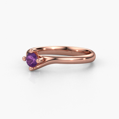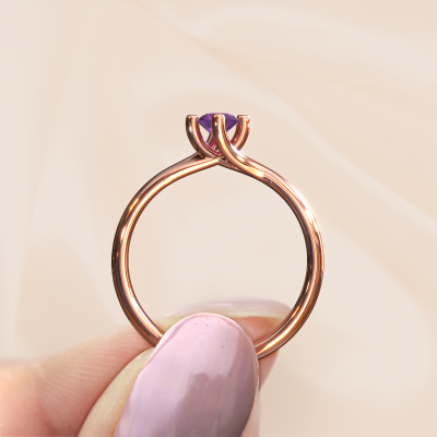 In your eyes, no one else compares to her. She is one in a million, unlike anyone else and pure? These qualities are emphasized perfectly by our modern rose gold solitaire amethyst ring. This amethyst is carefully selected by our keen artisan goldsmiths. It equals the unique qualities of the love of your life. There is no better way to memorialize your proposal than this symbol of true love. The ring shown above is called the Dewi Round, we call this a solitaire ring because it contains a single gemstone. The engagement ring is made in 14 Carat rose gold and has a round amethyst of 4 mm. Each piece of jewellery is made to shine bright around your finger. Each jewel is hand made with love by our goldsmiths.After receiving your order, our goldsmiths will passionately start the creative process of making your engagement ring in our own studio. Because we don't have a big stockpile, these costs will not be passed on to you. Our pricing is proof of that! We offer top quality jewels at lowest price, guaranteed.Different styles of new rings are made daily by our team. Perhaps you have found a solitaire engagement ring somewhere. One you would like to give to your loved one. Please feel free to share your thoughts and design with our jewel designers. We would love to turn your design into a modern engagement ring. You can follow the development of your ring design because we use very detailed 3D drawings. On top of that, you can order a dummy of the design. A dummy is a plastic ring, which can be shaped according your ring design. You can try it on and check if the engagement ring is up to standard. We will gladly send you a non-binding offer, based on a fair price/ quality ratio. The offer will baffle you, considering the quality of the ring and gemstones.To make it easier for you, we offer a 30 day return policy. Check our terms and conditions.