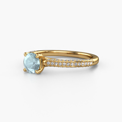The ring shown above is called the Elenore rnd. We call this type of ring a pavé solitaire ring because it has one centre gemstone and a band that is also pave set with gemstones. This engagement ring is made in 14 Carat gold set with a 5.4 mm round aquamarine, and pave set lab-grown diamonds at the sides. Each piece of jewellery is made just for you by our master goldsmiths in our own studio.This exclusive gold pavé solitaire engagement ring has an exquisite round aquamarine centre stone. To further accentuate the centre stone, the band is set full with more lab-grown diamonds. Its open prong setting allows light to strike the aquamarine from various angles and this adds sparkle to your aquamarine ring. The photo shown above depicts the goldsmith's carefully handcrafted details of the ring. The high positioning of the centre stone is truly eye-catching. The perfect engagement ring for the crown jewel of your life!By using a combination of the latest modern techniques, combined with ancient crafting, we can make all our engagement rings in our own studio. Each jewel is made to order. This is advantageous because we can offer you a price you won't find anywhere else.Have you found a specific engagement ring somewhere which you would like to give to your loved one? Please feel free to express your wishes to our jewel designers because we would be honoured to turn your design into a exclusive engagement ring. You can follow the development of your ring design because we use 3D drawings. This gives you a realistic preview of how your design will look. You can also preorder a dummy. A dummy is a plastic ring, which can be shaped according your ring design. You can try it on and check if its width and size are suitable for you. We will gladly send you a non-binding offer, based on a fair price/ quality ratio. It will amaze you, considering the quality of the ring and gemstones.To make it easier for you, we offer a 30 day return policy. Check our terms and conditions.