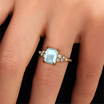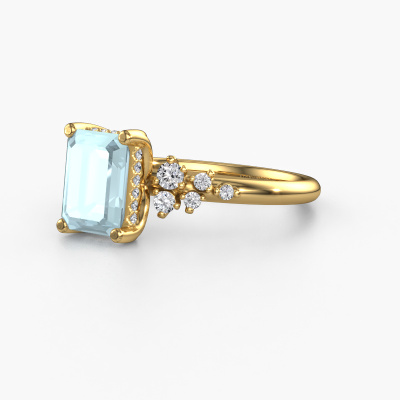 The ring shown above is called the Emma EME. We call this type of ring a pavé solitaire ring because it has one centre gemstone and a band that is also pave set with gemstones. This engagement ring is made in 14 Carat gold set with a 8x6 mm emerald cut aquamarine, and pave set lab-grown diamonds at the sides. Each piece of jewellery is made with passion and love by one of our master goldsmiths.This fantasy gold pavé solitaire engagement ring has an exquisite emerald cut aquamarine centre stone. To further accentuate the centre stone, the band is set full with more lab-grown diamonds. Its open prong setting allows light to strike the aquamarine from various angles and this adds sparkle to your aquamarine ring. The photo shown above depicts the goldsmith's carefully handcrafted details of the ring. The high positioning of the centre stone is truly eye-catching. The perfect engagement ring for the crown jewel of your life!After receiving your order, our goldsmiths will passionately start the creative process of making your engagement ring in our own studio. Because we don't have a big stockpile, these costs will not be passed on to you. Our pricing is proof of that! We offer top quality jewels at lowest price, guaranteed.Our team adds new designs to our online collection daily. Our designers and goldsmiths work together in creating the best design. We strive to offer a diverse collection of jewels. Perhaps you have a specific jewel design in mind. One you came across somewhere. Please contact us for a free consultation. We will make you an offer, based on a fair price/ quality ratio, that will baffle you.To make it easier for you, we offer a 30 day return policy. Check our terms and conditions.