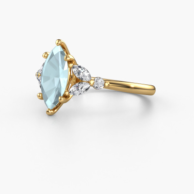 The ring shown above is called the Megan MRQ. We call this type of ring a pavé solitaire ring because it has one centre gemstone and a band that is also pave set with gemstones. This engagement ring is made in 14 Carat gold set with a 11x5.5 mm marquise aquamarine, and pave set lab-grown diamonds at the sides. Each piece of jewellery is made with passion and love by one of our master goldsmiths.This fantasy gold pavé solitaire engagement ring has an exquisite marquise aquamarine centre stone. To further accentuate the centre stone, the band is set full with more lab-grown diamonds. Its open prong setting allows light to strike the aquamarine from various angles and this adds sparkle to your aquamarine ring. The photo shown above depicts the goldsmith's carefully handcrafted details of the ring. The high positioning of the centre stone is truly eye-catching. The perfect engagement ring for the crown jewel of your life![bestp1v_long]Have you found a specific engagement ring somewhere which you would like to give to your loved one? Please feel free to express your wishes to our jewel designers because we would be honoured to turn your design into a fantasy engagement ring. You can follow the development of your ring design because we use 3D drawings. This gives you a realistic preview of how your design will look. You can also preorder a dummy. A dummy is a plastic ring, which can be shaped according your ring design. You can try it on and check if its width and size are suitable for you. We will gladly send you a non-binding offer, based on a fair price/ quality ratio. It will amaze you, considering the quality of the ring and gemstones.To make it easier for you, we offer a 30 day return policy. Check our terms and conditions.