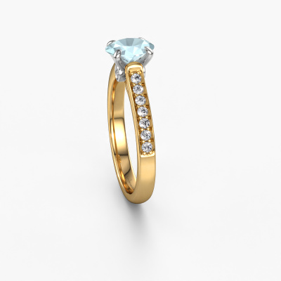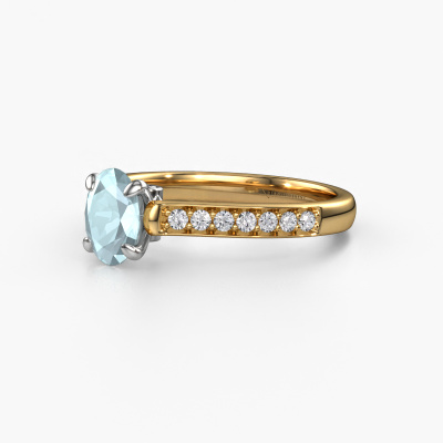The ring shown above is called the Valorie ovl 2. We call this type of ring a pavé solitaire ring because it has one centre gemstone and a band that is also pave set with gemstones. This engagement ring is made in 14 Carat gold set with a 7x5 mm oval aquamarine, and pave set lab-grown diamonds at the sides. Each piece of jewellery is made with passion and love by one of our master goldsmiths.This fashionable gold pavé solitaire engagement ring has an exquisite oval aquamarine centre stone. To further accentuate the centre stone, the band is set full with more lab-grown diamonds. Its open prong setting allows light to strike the aquamarine from various angles and this adds sparkle to your aquamarine ring. The photo shown above depicts the goldsmith's carefully handcrafted details of the ring. The high positioning of the centre stone is truly eye-catching. The perfect engagement ring for the crown jewel of your life!Are you on a budget? Please feel free to contact us, so we can go discuss your options. We offer our engagement rings at guaranteed best price, because we make them to order. You won't find such a price anywhere else!Our team adds new designs to our online collection daily. Our designers and goldsmiths work together in creating the best design. We strive to offer a diverse collection of jewels. Perhaps you have a specific jewel design in mind. One you came across somewhere. Please contact us for a free consultation. We will make you an offer, based on a fair price/ quality ratio, that will baffle you.To make it easier for you, we offer a 30 day return policy. Check our terms and conditions.