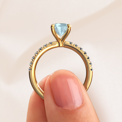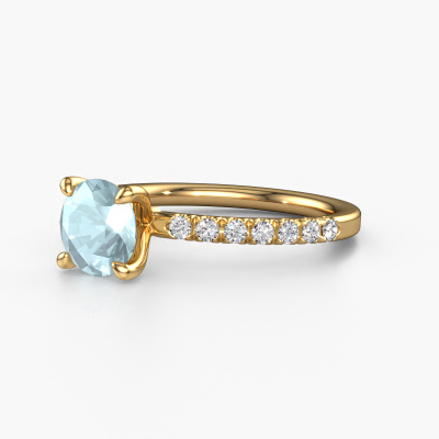 The ring shown above is called the Crystal RND 2. We call this type of ring a pavé solitaire ring because it has one centre gemstone and a band that is also pave set with gemstones. The 14 Carat gold engagement ring is set with a round 7 mm aquamarine centre stone and the band is pave set with lab grown diamond gemstones. Each jewel is unique in every way! Simply customize to your liking,This classic gold pavé solitaire engagement ring has an exquisite round aquamarine centre stone. To further accentuate the centre stone, the band is fully set with more lab-grown diamonds. Its open prong setting allows light to strike the aquamarine from various angles and this adds sparkle to your aquamarine ring. The photo shown above depicts the goldsmith's carefully handcrafted details of the ring. The high positioning of the centre stone is truly eye-catching. The perfect engagement ring for the crown jewel of your life! After receiving your order, our goldsmiths will start the creative process of making your Crystal RND 2 engagement ring. We don't keep stock. This is advantageous because these costs will not be passed on to you. Therefore, we can offer jewellery at exceptionally low prices.Different styles of new rings are made daily by our team. Perhaps you have found a pavé solitaire engagement ring somewhere. One you would like to give to your loved one. Please feel free to share your thoughts and design with our jewel designers. We would love to turn your design into a classic engagement ring. You can follow the development of your ring design because we use very detailed 3D drawings. On top of that, you can order a dummy of the design. A dummy is a plastic ring, which can be shaped according your ring design. You can try it on and check if the engagement ring is up to standard. We will gladly send you a non-binding offer, based on a fair price/ quality ratio. The offer will baffle you, considering the quality of the ring and gemstones.To make it easier for you, we offer a 30 day return policy. Check our terms and conditions.