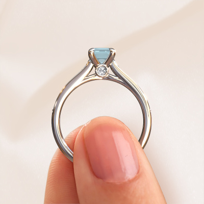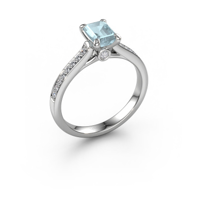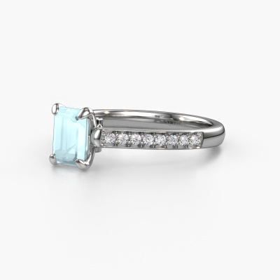 The ring shown above is called the Valorie eme 2. We call this type of ring a pavé solitaire ring because it has one centre gemstone and a band that is also pave set with gemstones. The platinum engagement ring is set with a emerald cut 6.5x4.5 mm aquamarine centre stone and the band is pave set with diamond gemstones. Each jewel is made by a team of passionate goldsmiths and jewel designers. This will make your crown jewel truly eye-catching.This classic platinum pavé solitaire engagement ring has an exquisite emerald cut aquamarine centre stone. To further accentuate the centre stone, the band is fully set with more diamonds. Its open prong setting allows light to strike the aquamarine from various angles and this adds sparkle to your aquamarine ring. The photo shown above depicts the goldsmith's carefully handcrafted details of the ring. The high positioning of the centre stone is truly eye-catching. The perfect engagement ring for the crown jewel of your life! By using our modern techniques, we can design and customize the finest quality jewels with the utmost care for you. Our engagement rings are always priced 30 percent lower than other jewellers. We make engagement rings to order so we don't have to maintain a large stock. If you have a certain budget, we are more than happy to advice you accordingly.Have you found a specific engagement ring somewhere which you would like to give to your loved one? Please feel free to express your wishes to our jewel designers because we would be honoured to turn your design into a classic engagement ring. You can follow the development of your ring design because we use 3D drawings. This gives you a realistic preview of how your design will look. You can also preorder a dummy. A dummy is a plastic ring, which can be shaped according your ring design. You can try it on and check if its width and size are suitable for you. We will gladly send you a non-binding offer, based on a fair price/ quality ratio. It will amaze you, considering the quality of the ring and gemstones.To make it easier for you, we offer a 30 day return policy. Check our terms and conditions.