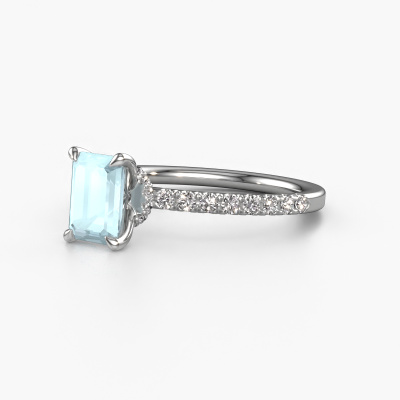 The ring shown above is called the Crystal EME 4. We call this type of ring a pavé solitaire ring because it has one centre gemstone and a band that is also pave set with gemstones. The platinum engagement ring is set with a emerald cut 7x5 mm aquamarine centre stone and the band is pave set with lab grown diamond gemstones. Each jewel is created to add sparkle to your finger, each jewel is lovingly made by hand by our goldsmiths.This fashionable platinum pavé solitaire engagement ring has an exquisite emerald cut aquamarine centre stone. To further accentuate the centre stone, the band is fully set with more lab-grown diamonds. Its open prong setting allows light to strike the aquamarine from various angles and this adds sparkle to your aquamarine ring. The photo shown above depicts the goldsmith's carefully handcrafted details of the ring. The high positioning of the centre stone is truly eye-catching. The perfect engagement ring for the crown jewel of your life! After receiving your order, our goldsmiths will passionately start the creative process of making your engagement ring in our own studio. Because we don't have a big stockpile, these costs will not be passed on to you. Our pricing is proof of that! We offer top quality jewels at lowest price, guaranteed.Our team adds new designs to our online collection daily. Our designers and goldsmiths work together in creating the best design. We strive to offer a diverse collection of jewels. Perhaps you have a specific jewel design in mind. One you came across somewhere. Please contact us for a free consultation. We will make you an offer, based on a fair price/ quality ratio, that will baffle you.To make it easier for you, we offer a 30 day return policy. Check our terms and conditions.