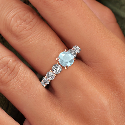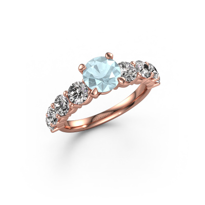 The ring shown above is called the Deja. We call this type of ring a pavé solitaire ring because it has one centre gemstone and a band that is also pave set with gemstones. This engagement ring is made in 14 Carat rose gold set with a 6.5 mm round aquamarine, and pave set lab-grown diamonds at the sides. Each piece of jewellery is made just for you by our master goldsmiths in our own studio.This exclusive rose gold pavé solitaire engagement ring has an exquisite round aquamarine centre stone. To further accentuate the centre stone, the band is set full with more lab-grown diamonds. Its open prong setting allows light to strike the aquamarine from various angles and this adds sparkle to your aquamarine ring. The photo shown above depicts the goldsmith's carefully handcrafted details of the ring. The high positioning of the centre stone is truly eye-catching. The perfect engagement ring for the crown jewel of your life!By using a combination of the latest modern techniques, combined with ancient crafting, we can make all our engagement rings in our own studio. Each jewel is made to order. This is advantageous because we can offer you a price you won't find anywhere else.Our team adds new designs to our online collection daily. Our designers and goldsmiths work together in creating the best design. We strive to offer a diverse collection of jewels. Perhaps you have a specific jewel design in mind. One you came across somewhere. Please contact us for a free consultation. We will make you an offer, based on a fair price/ quality ratio, that will baffle you.To make it easier for you, we offer a 30 day return policy. Check our terms and conditions.