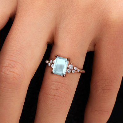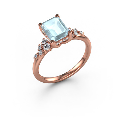 The ring shown above is called the Emma EME. We call this type of ring a pavé solitaire ring because it has one centre gemstone and a band that is also pave set with gemstones. This engagement ring is made in 14 Carat rose gold set with a 8x6 mm emerald cut aquamarine, and pave set lab-grown diamonds at the sides. Each piece of jewellery is made with passion and love by one of our master goldsmiths.This fantasy rose gold pavé solitaire engagement ring has an exquisite emerald cut aquamarine centre stone. To further accentuate the centre stone, the band is set full with more lab-grown diamonds. Its open prong setting allows light to strike the aquamarine from various angles and this adds sparkle to your aquamarine ring. The photo shown above depicts the goldsmith's carefully handcrafted details of the ring. The high positioning of the centre stone is truly eye-catching. The perfect engagement ring for the crown jewel of your life!After receiving your order, our goldsmiths will passionately start the creative process of making your engagement ring in our own studio. Because we don't have a big stockpile, these costs will not be passed on to you. Our pricing is proof of that! We offer top quality jewels at lowest price, guaranteed.Our team adds new designs to our online collection daily. Our designers and goldsmiths work together in creating the best design. We strive to offer a diverse collection of jewels. Perhaps you have a specific jewel design in mind. One you came across somewhere. Please contact us for a free consultation. We will make you an offer, based on a fair price/ quality ratio, that will baffle you.To make it easier for you, we offer a 30 day return policy. Check our terms and conditions.