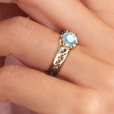 The ring shown above is called the Shan, we call this a solitaire ring because it contains a single gemstone. The engagement ring is made in 14 Carat white gold and has a round aquamarine of 6 mm. The cool thing about our configurator is that you can compile your own piece of jewellery, into a completely personalized one. This solitaire ring is crafted in the precious metals white gold with gold, but of course you are free to pick your own colours. Each piece of jewellery is made by a team of passionate goldsmiths and jewel designers. This will make your crown jewel truly eye-catching.The solitaire ring is a special type of engagement ring. Its open prong setting allows light to strike the gemstone from various angles. This Celtic engagement ring is a stunning eye-catcher because of the high positioning of the gemstone. In order for you to commemorate your proposal with a unique ring, we carefully adorn this solitaire ring by hand. The love of your life deserves nothing but the best. By using our modern techniques, we can design and customize the finest quality jewels with the utmost care for you. Our engagement rings are always priced 30 percent lower than other jewellers. We make engagement rings to order so we don't have to maintain a large stock. If you have a certain budget, we are more than happy to advice you accordingly.Have you found a specific engagement ring somewhere which you would like to give to your loved one? Please feel free to express your wishes to our jewel designers because we would be honoured to turn your design into a Celtic engagement ring. You can follow the development of your ring design because we use 3D drawings. This gives you a realistic preview of how your design will look. You can also preorder a dummy. A dummy is a plastic ring, which can be shaped according your ring design. You can try it on and check if its width and size are suitable for you. We will gladly send you a non-binding offer, based on a fair price/ quality ratio. It will amaze you, considering the quality of the ring and gemstones.To make it easier for you, we offer a 30 day return policy. Check our terms and conditions.