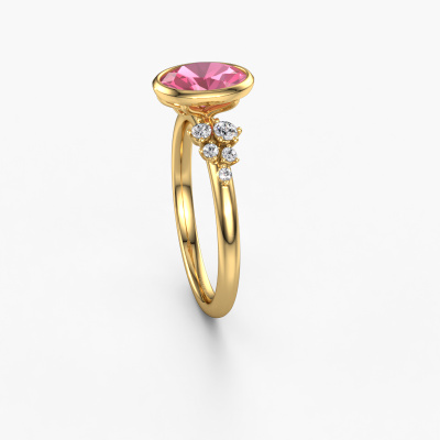 This 14 Carat gold ring is called Aliyah OVL and is set with pink sapphire. Do you keep up with the latest fashion trends? Do you want a unique engagement ring that matches your lifestyle? This special engagement ring is an extraordinary ring which can be custom-made to fit your or her personal style. This modern gold engagement ring is set with pink sapphire. Our pink sapphire are carefully selected for this specific ring in order to create the best effect. Our expert goldsmith will create your ring in our own artisan studio where the pink sapphire will be set with great care. The ring will then be polished to perfection. Nothing but the best for the love of your life! This jewel is made by a team of passionate goldsmiths and jewel designers. This will make your crown jewel truly eye-catching.By using a combination of the latest modern techniques, combined with ancient crafting, we can make all our engagement rings in our own studio. Each jewel is made to order. This is advantageous because we can offer you a price you won't find anywhere else.Different styles of new rings are made daily by our team. Perhaps you have found a bezel set engagement ring somewhere. One you would like to give to your loved one. Please feel free to share your thoughts and design with our jewel designers. We would love to turn your design into a modern engagement ring. You can follow the development of your ring design because we use very detailed 3D drawings. On top of that, you can order a dummy of the design. A dummy is a plastic ring, which can be shaped according your ring design. You can try it on and check if the engagement ring is up to standard. We will gladly send you a non-binding offer, based on a fair price/ quality ratio. The offer will baffle you, considering the quality of the ring and gemstones.To make it easier for you, we offer a 30 day return policy. Check our terms and conditions.