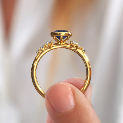 This 14 Carat gold ring is called Aliyah OVL and is set with sapphire. Do you keep up with the latest fashion trends? Do you want a unique engagement ring that matches your lifestyle? This special engagement ring is an extraordinary ring which can be custom-made to fit your or her personal style. This modern gold engagement ring is set with sapphire. Our sapphire are carefully selected for this specific ring in order to create the best effect. Our expert goldsmith will create your ring in our own artisan studio where the sapphire will be set with great care. The ring will then be polished to perfection. Nothing but the best for the love of your life! This jewel is made by a team of passionate goldsmiths and jewel designers. This will make your crown jewel truly eye-catching.By using a combination of the latest modern techniques, combined with ancient crafting, we can make all our engagement rings in our own studio. Each jewel is made to order. This is advantageous because we can offer you a price you won't find anywhere else.Different styles of new rings are made daily by our team. Perhaps you have found a bezel set engagement ring somewhere. One you would like to give to your loved one. Please feel free to share your thoughts and design with our jewel designers. We would love to turn your design into a modern engagement ring. You can follow the development of your ring design because we use very detailed 3D drawings. On top of that, you can order a dummy of the design. A dummy is a plastic ring, which can be shaped according your ring design. You can try it on and check if the engagement ring is up to standard. We will gladly send you a non-binding offer, based on a fair price/ quality ratio. The offer will baffle you, considering the quality of the ring and gemstones.To make it easier for you, we offer a 30 day return policy. Check our terms and conditions.