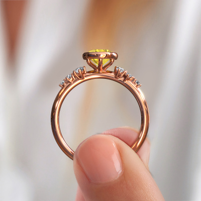 This 14 Carat rose gold ring is called Aliyah OVL and is set with yellow sapphire. Do you keep up with the latest fashion trends? Do you want a unique engagement ring that matches your lifestyle? This special engagement ring is an extraordinary ring which can be custom-made to fit your or her personal style. This modern rose gold engagement ring is set with yellow sapphire. Our yellow sapphire are carefully selected for this specific ring in order to create the best effect. Our expert goldsmith will create your ring in our own artisan studio where the yellow sapphire will be set with great care. The ring will then be polished to perfection. Nothing but the best for the love of your life! This jewel is made by a team of passionate goldsmiths and jewel designers. This will make your crown jewel truly eye-catching.By using a combination of the latest modern techniques, combined with ancient crafting, we can make all our engagement rings in our own studio. Each jewel is made to order. This is advantageous because we can offer you a price you won't find anywhere else.Different styles of new rings are made daily by our team. Perhaps you have found a bezel set engagement ring somewhere. One you would like to give to your loved one. Please feel free to share your thoughts and design with our jewel designers. We would love to turn your design into a modern engagement ring. You can follow the development of your ring design because we use very detailed 3D drawings. On top of that, you can order a dummy of the design. A dummy is a plastic ring, which can be shaped according your ring design. You can try it on and check if the engagement ring is up to standard. We will gladly send you a non-binding offer, based on a fair price/ quality ratio. The offer will baffle you, considering the quality of the ring and gemstones.To make it easier for you, we offer a 30 day return policy. Check our terms and conditions.