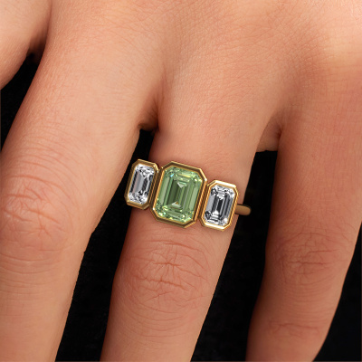 This 14 Carat gold ring is called Lavon 3 EME and is set with 8x6 mm green lab grown diamond. This exclusive gold bezel set engagement ring is a true work of art! The ornaments are crafted with a lot of patience and great passion. In order to create this ring with great precision, this craft requires a keen eye and skilful hand. A challenge which ignites a fire in our expert goldsmith. The exquisite green lab grown diamonds are set in a special way so they stand out even more. This gives the ring an even more glamorous appearance. The special engagement ring is actually unique on its own because of the gemstones which we carefully select especially for this ring. On top of that you select the precious metals which will be used to create a unique ring for the most extraordinary woman in your life! This jewel [extra1_long][bestp1v_long]Do you have a specific ring in mind? One you came across somewhere. Please feel free to tell us your wishes and we will turn your design into a unique engagement ring. You can follow the development of your ring design because we use 3D drawings. This gives you a realistic preview of your design. We will gladly send you a non-binding offer, based on a fair price/ quality ratio. It will amaze you.To make it easier for you, we offer a 30 day return policy. Check our terms and conditions.
